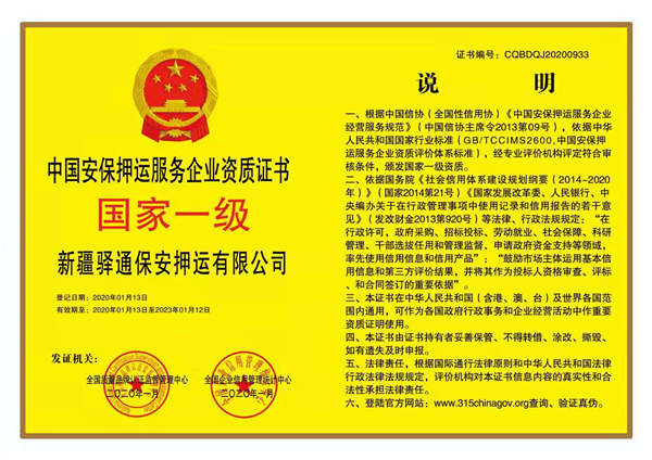 新疆驛通保安押運(yùn)有限公司,注冊(cè)資本1000萬(wàn)元人民幣,具有獨(dú)立法人資格,下設(shè)部門有:綜合管理辦公室、人力資源部、指揮中心、保衛(wèi)部、財(cái)務(wù)部、業(yè)務(wù)部、押運(yùn)部、督察隊(duì)、公司金庫(kù)。公司建立了符合市場(chǎng)和現(xiàn)代企業(yè)要求的經(jīng)營(yíng)運(yùn)作模式和管理機(jī)制,有一套較科學(xué)的經(jīng)營(yíng)管理制度、守押勤務(wù)制度、守押作業(yè)規(guī)范化操作制度和標(biāo)準(zhǔn)。